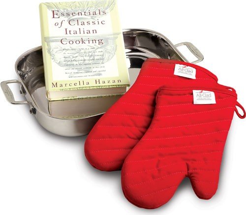 The All-Clad stainless steel lasagna pan heats quickly and evenly as a result of All-Clad's proprietary metals and design. The cooking surface of the lasagna pan is 18/10 stainless steel and will not react with acids, particularly important when making lasagna with tomato sauce. The set also includes two All Clad oven mitts and the cookbo